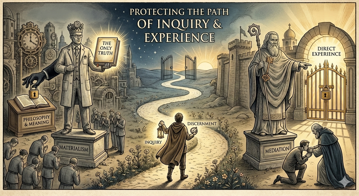 What must be defended is the ongoing possibility of inquiry and direct experience—the freedom to ask “how do we know?” and “what is my relationship to the transcendent?”—without institutional mediation claiming exclusive, comprehensive, or coercive authority over human understanding and connection.