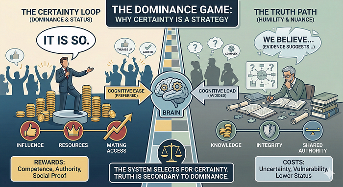 High-functioning individuals in these systems rarely speak in hypotheticals. They perform as the authority who decides what is real, rather than what might be real based on limited evidence. This display of unwavering confidence serves as a proxy for competence, translating directly into resource acquisition, social influence, and reproductive opportunities.